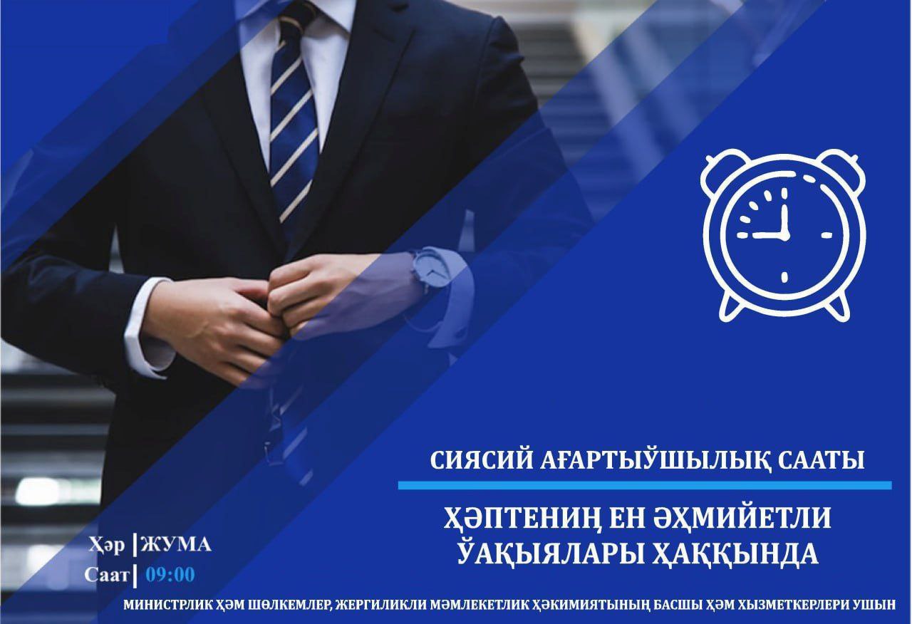 Bugun Qoraqalpog‘iston Respublikasi Qishloq xo‘jaligi vazirligida mutaxassislarning siyosiy bilim va malakasini oshirishga qaratilgan «Siyosiy ma’rifat soati» bo‘lib o‘tdi.Unda soha mutaxassislari mamlakatimizda va xorijda ro‘y berayotgan eng muhim bo‘lgan so‘nggi yangiliklarning mazmuni bilan yaqindan tanishdi.